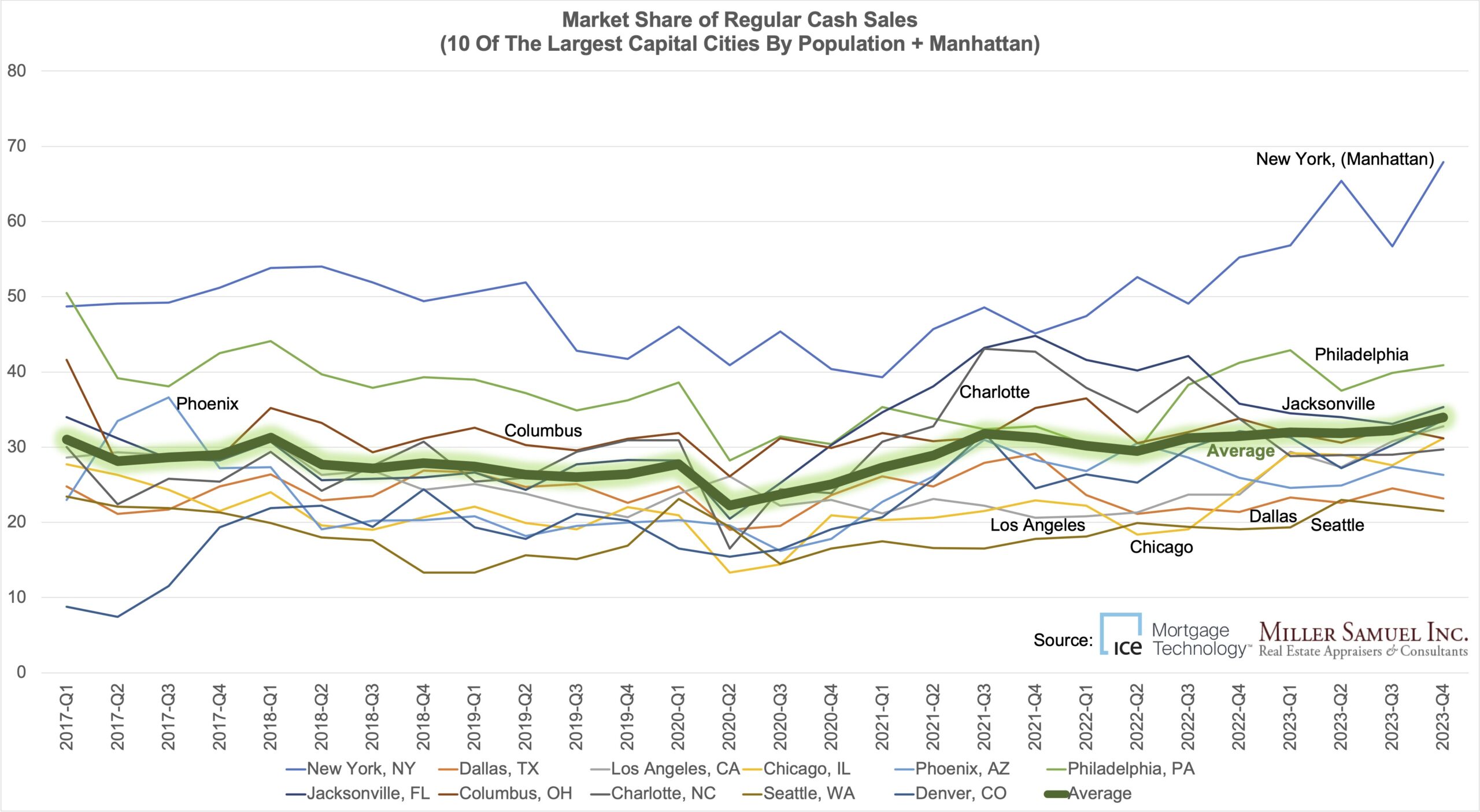 Late last year, Manhattan reached a record level of cash sales (68%) in the decade we’ve been tracking it. Higher mortgage rates drove cash buyers higher in Manhattan. I thought it would be interesting to look at other cities across the U.S. and picked ten state capitals with some of the highest populations. By averaging the results, cash buyers compose roughly 30% of “regular” sales (distressed investor sales are excluded).