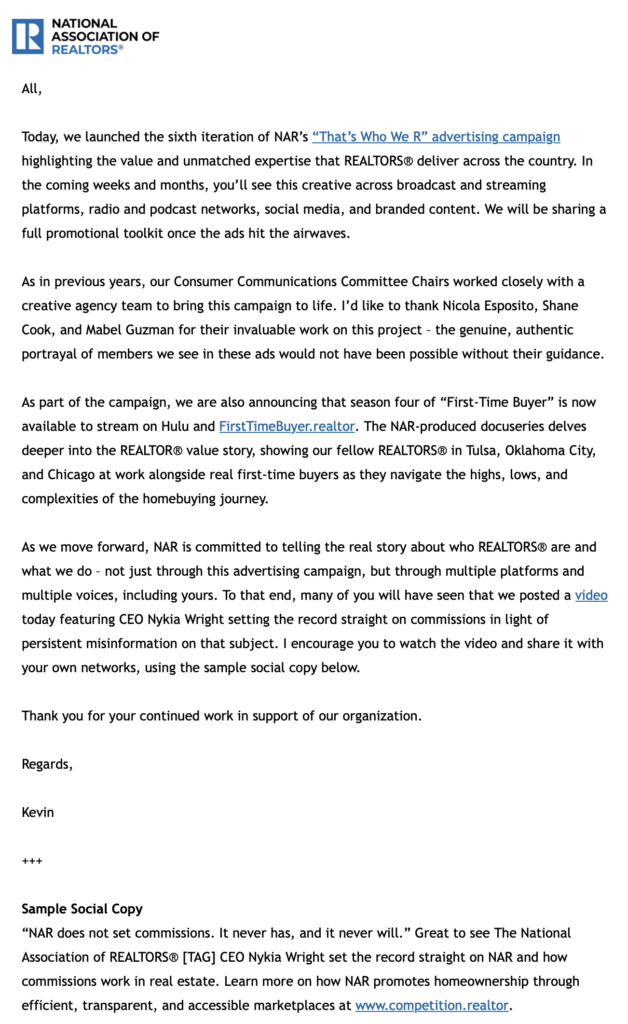 NAR shared this marketing campaign that they want their members to push. NAR has an ongoing multi-year “First-time buyer” marketing effort. He is offended as a dues-paying member to be forced to pay for NAR’s bad behavior.