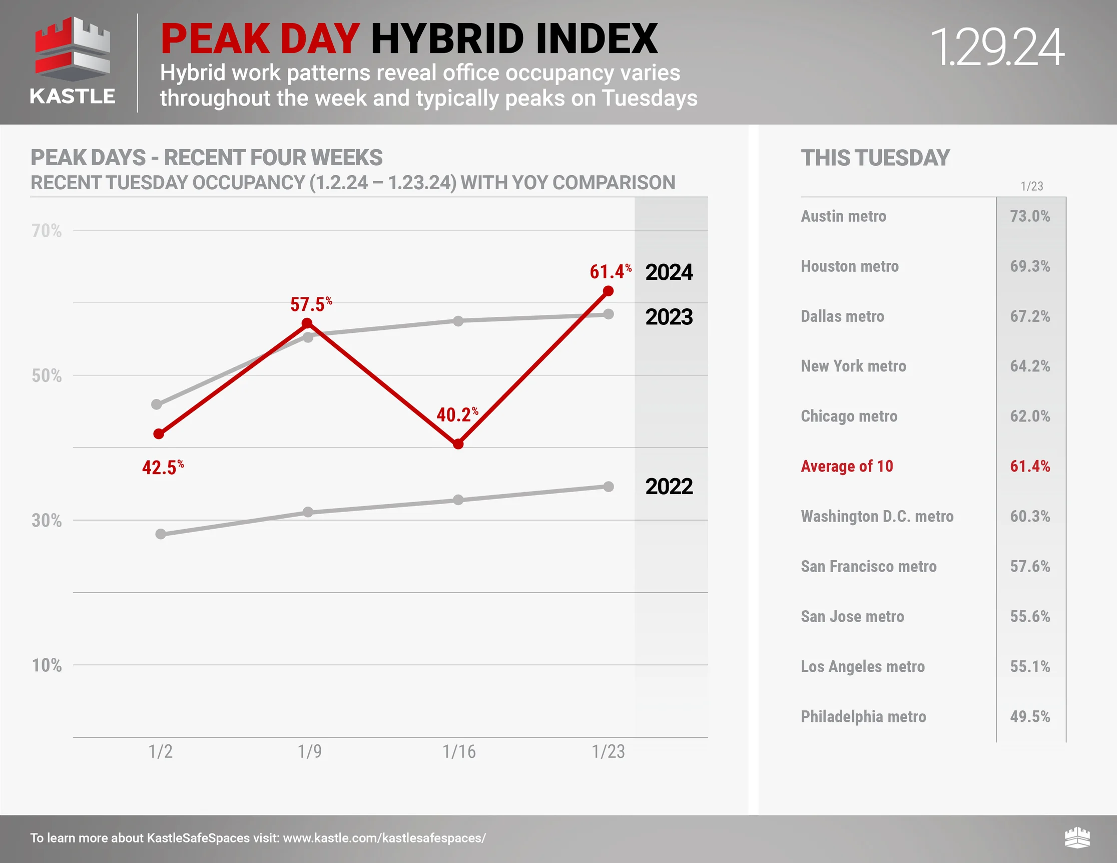Remember that Kastle charts are overstating occupancy* because their pre-pandemic occupancy benchmark was 100%, which is incorrect (*measures card swipe activity as a proxy for occupancy). Still, they’ve become the standard benchmark for occupancy rates.