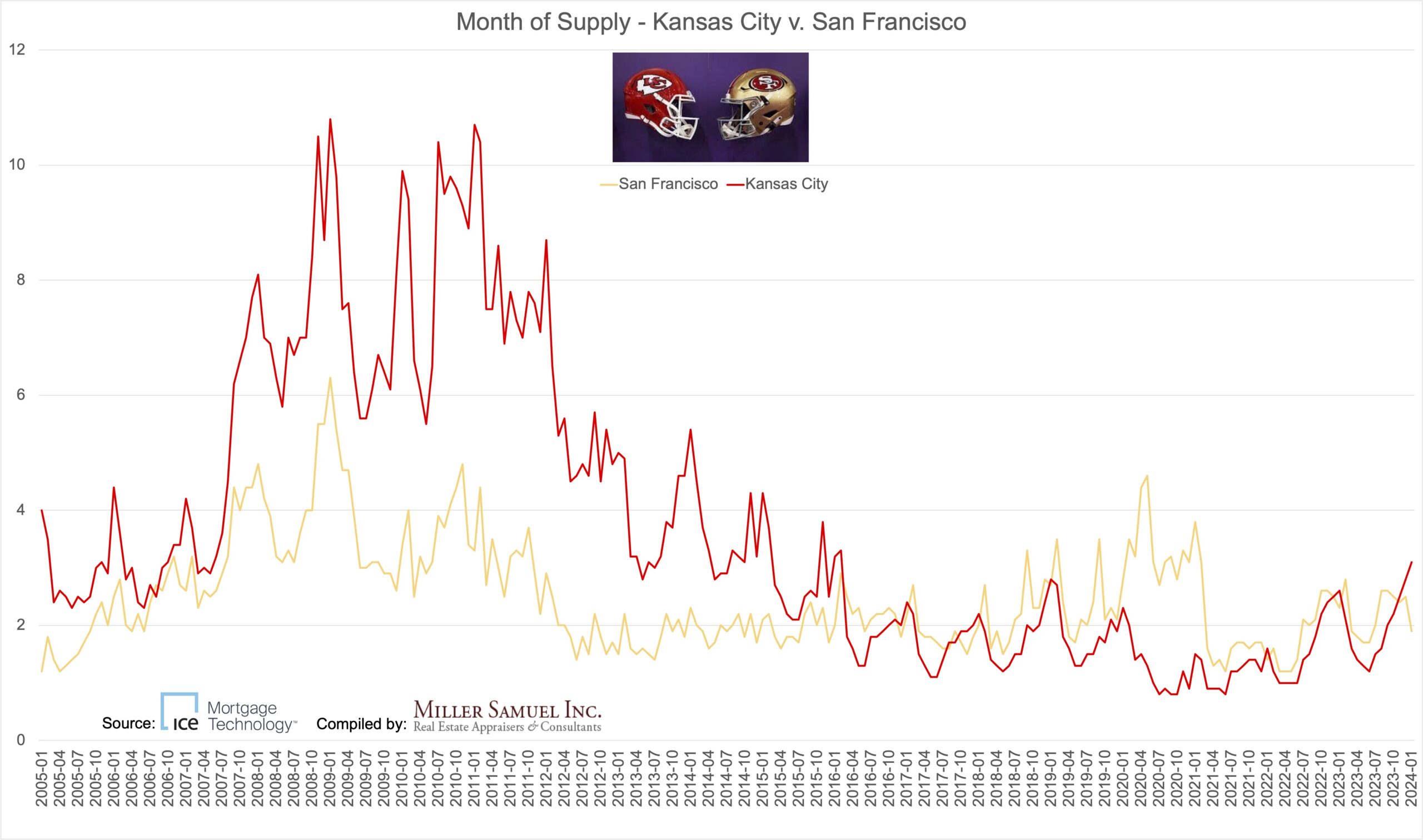 Ok I promise, that’s the last “Taylor Swift” pun of today’s newsletter. After thoroughly enjoying last weekend’s Super Bowl with a bunch of good friends in Chicago, I wondered how the two team’s housing markets compared (obviously I would think that). And since months of supply (or market pace) – the number of months to sell all available supply at the current sales rate – is a great way to look at the intersection of supply and demand – and sales have been slowed by much higher mortgage rates – and listing inventory has been chronically low coming out of the pandemic era, I got to work.