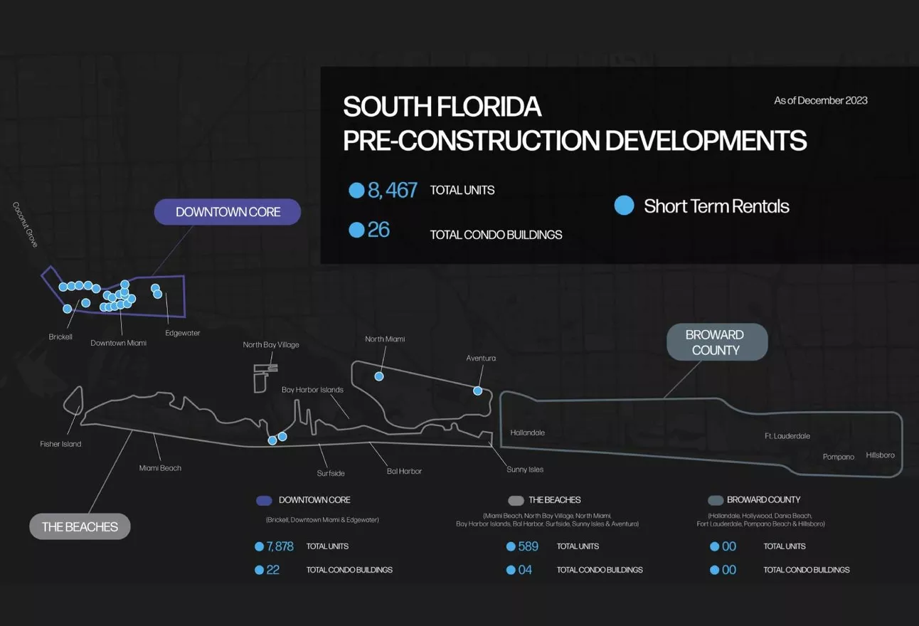 Across Downtown Miami, Brickell, Edgewater and Miami Beach, 8,467 short-term rental condos are planned across 26 projects, 55.6% of the total 15,216-unit development pipeline in the area, according to a report from the South Florida real estate firm ISG World.
