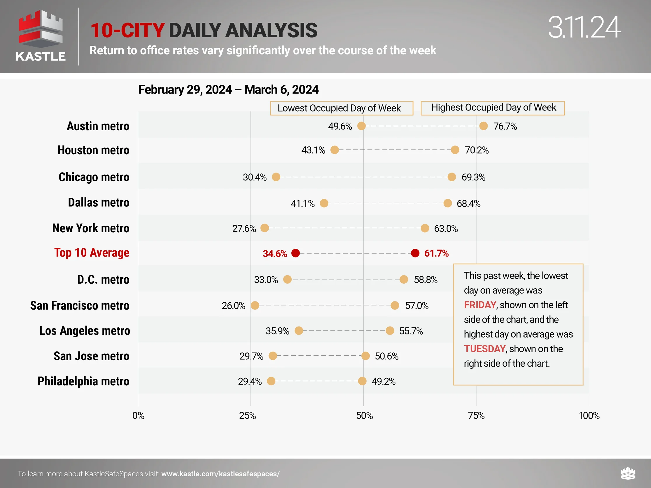 Remember that Kastle charts are overstating occupancy* because their pre-pandemic occupancy benchmark was 100%, which is incorrect (*measures card swipe activity as a proxy for occupancy). Still, they’ve become the standard benchmark for occupancy rates.
