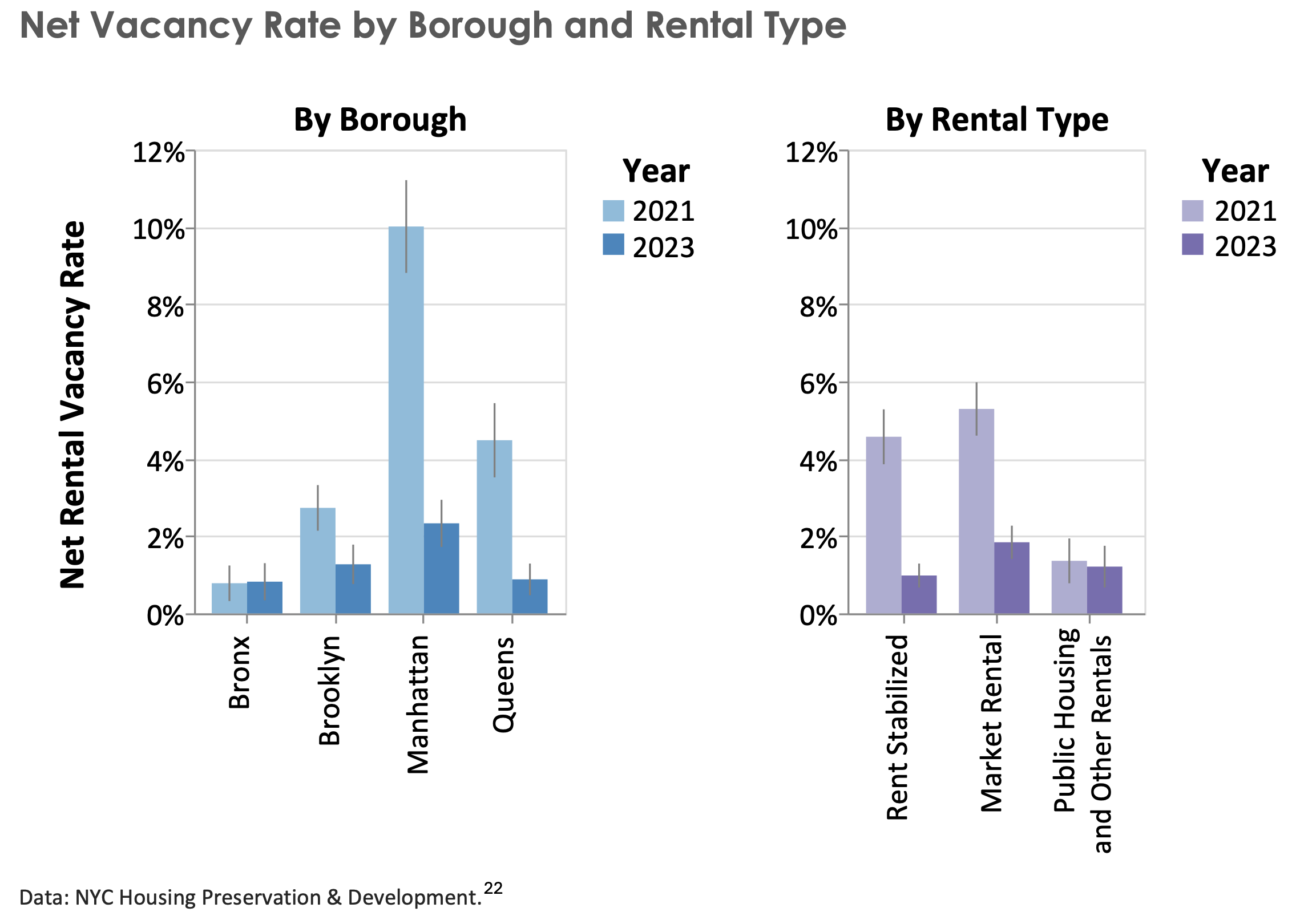 - The vacancy rate among rent stabilized apartments in NYC is even lower than the vacancy rate for all rental units, declining from 4.57% in the 2021 HVS to 0.98% in the 2023 HVS.