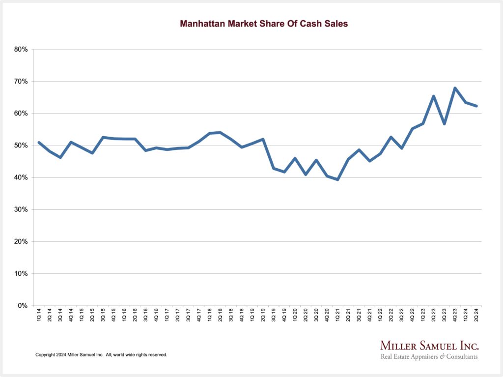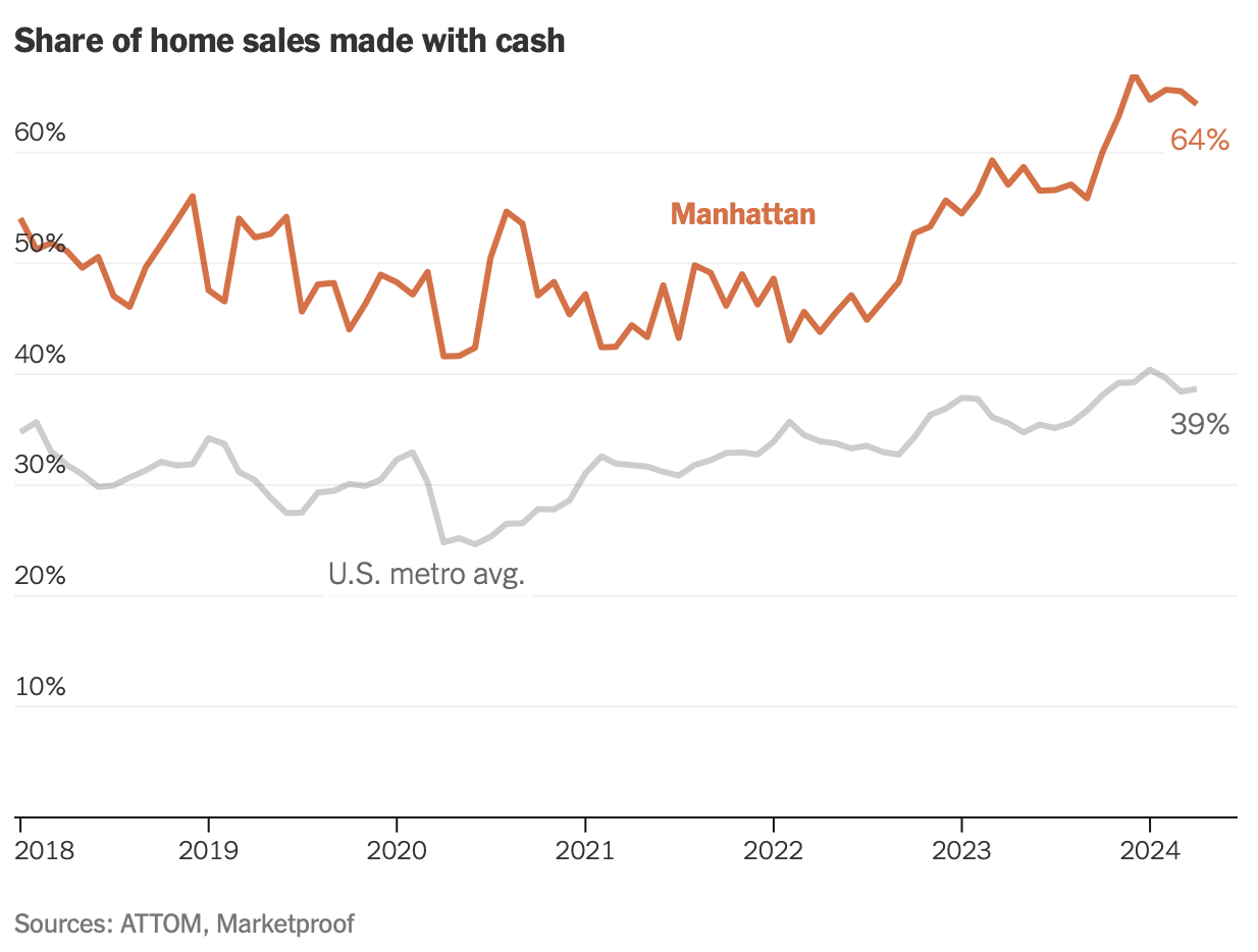 - Manhattan cash buyers account for two-thirds of all home sales, higher than normal