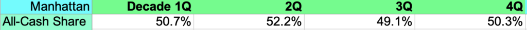 I’m not quite sure if seasonality for cash buyers is a thing. However, in Manhattan, the second quarter from April to June has shown the highest share of cash buyers over the decade at 52.2%. Perhaps because the spring selling season represents an uptick of buyers coming out of the winter doldrums and one of the highest sales periods of the year, the greater frenzy might raise the probability of more cash buyers.