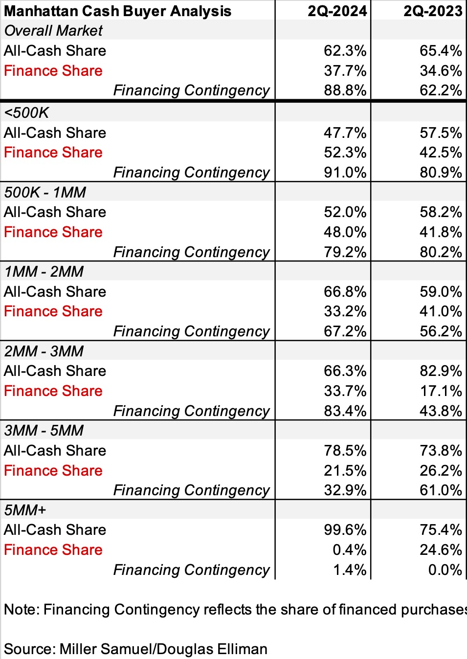 Although our research showed Manhattan cash purchases peaked in Q4-2023 at 67.9% and the share of cash buyers remains historically elevated, the smaller share of finance buyers is seeing a lot more mortgage contingencies. In the following table, during the second quarter, cash buyers represented more than 60% of purchases for the fourth of the five past quarters while the quarterly average since 2014 has been 50.5%. But what is additionally interesting is that of the 37.7% of buyers who financed in Q2-2024, 88.8% of them purchased with a finance contingency, up sharply from last year when it was 62.2%.