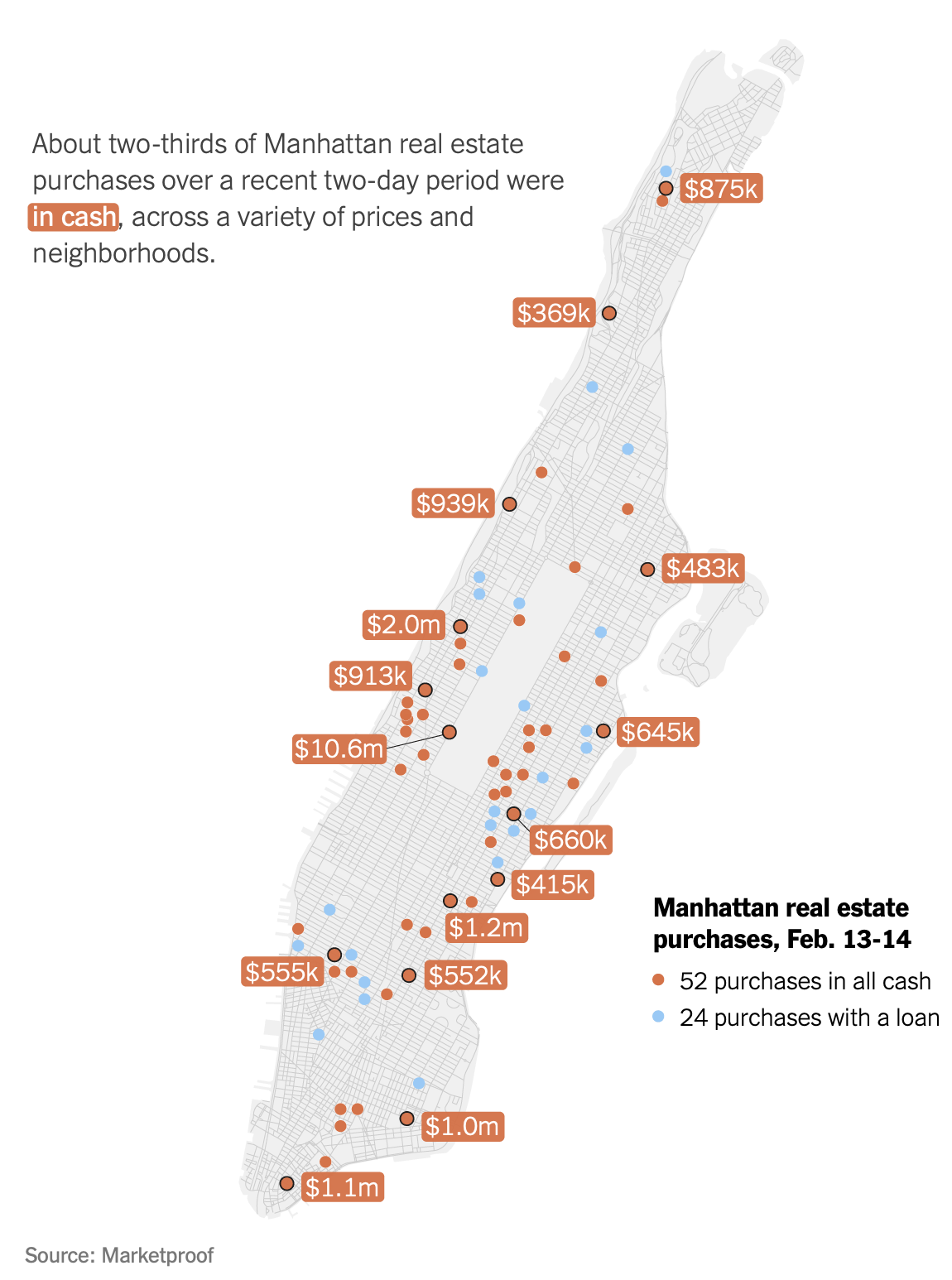 - In Manhattan, the probability of a cash buyer rises with higher purchase prices as illustrated in Marketproof‘s data in this useful NY Times illustration..