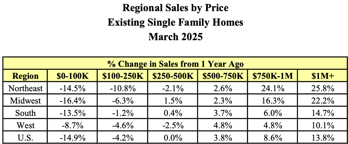 The idea that a mega US home sale just occured as the financial markets show massive volatility because of a poorly conceived trade policy (implemented without evidence of a plan or strategy) is about all the evidence you need for the disconnect between the housing market for “mere mortals” and the uber-wealthy. “Damaged” is the right word to use to describe the US housing market. Despite the volatility of the financial markets in recent weeks after realizing that there was no valid plan or strategy behind “Liberation Day,” mega sales continue to occur unabated. It’s essential to recognize that these mega sales represent a tiny fraction of 1% of US home sales since overall home sales are weak. The higher end of the housing market continues to see more sales growth as the following table clearly shows.