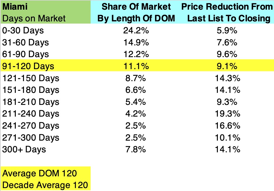 This morning, I took a look at three cities I track in the Douglas Elliman market report series I’ve been authoring since 1994. The premise was to understand how much overpricing impacts the length of time a listing sits on the market. The second step not covered here is to consider how excessive pricing would affect the final sales price. I had partnered up with the NYU Furman Center, but the other band members moved on to other ventures after we published our first paper. To prevent this post from being too wonky, I only considered the last list price before a listing sold, rather than the original list price and all the subsequent cuts. I also focused on closing data rather than contracts for two reasons. Firstly, pricing for contract data isn’t generally available, and secondly, NAR data suggests that prices fall on average by 2% from contract date to closing date. The market hasn’t tested the original list price, and the last list price reflects the moment a listing entered the market and was finally sold. One of the frustrations felt by many real estate agents occurs when a seller says (I’m paraphrasing something I was told a seller said at a speaking engagement in Westchester County, NY), “Lets test my obviously wildly high dream price and if it doesn’t sell, we’ll drop the price to something reasonable. What if a Middle Eastern sheik wants to buy my raised ranch in this 1950s subdivision for double what it is worth for cash?” My quick response would be: “Have you ever heard of the Internet?” For the following analysis, I looked at the most recent data I had for Manhattan, Miami, and Orange County, and the results were quite different by region. Here is the NAR table that inspired this Housing Note.