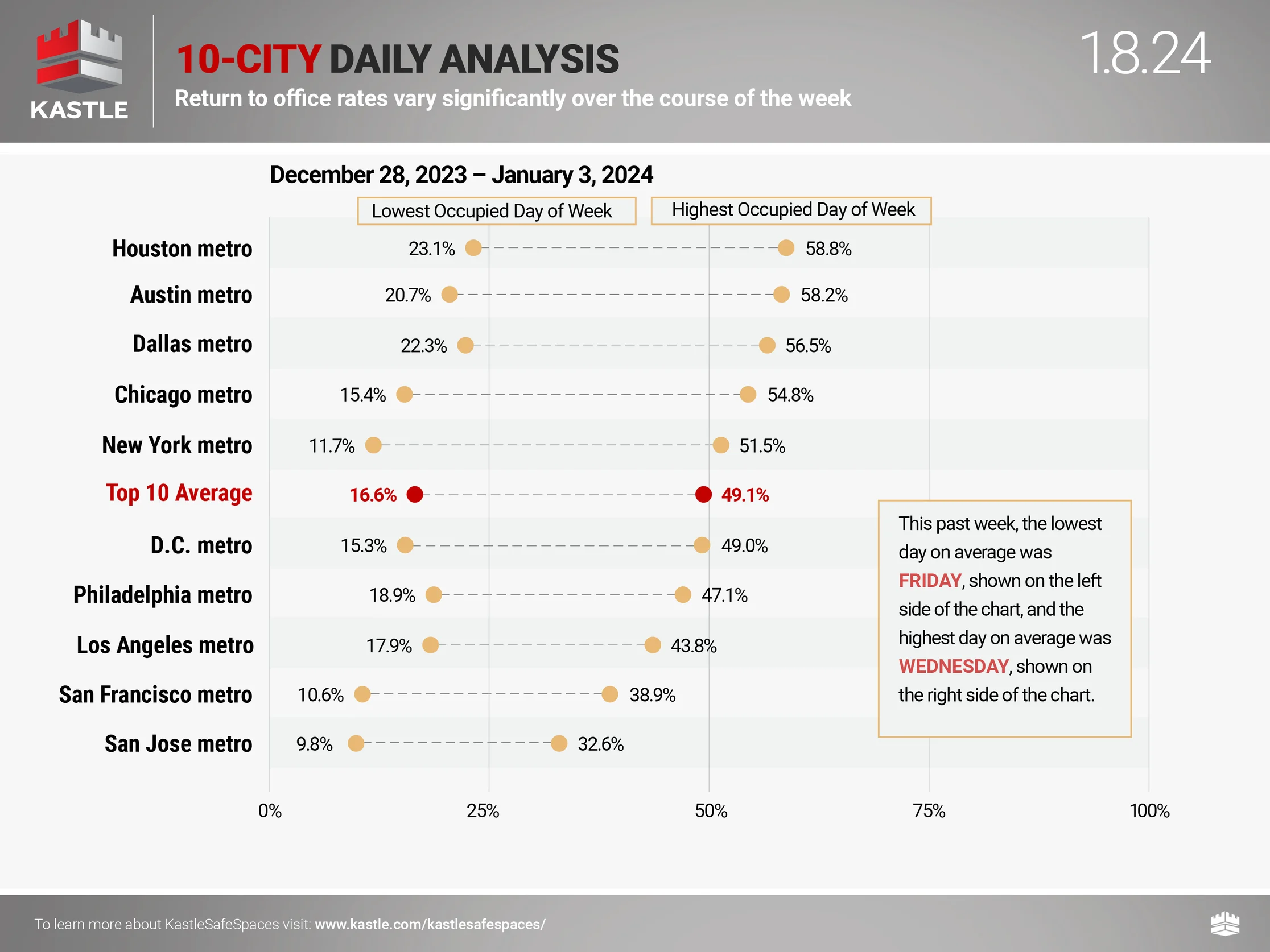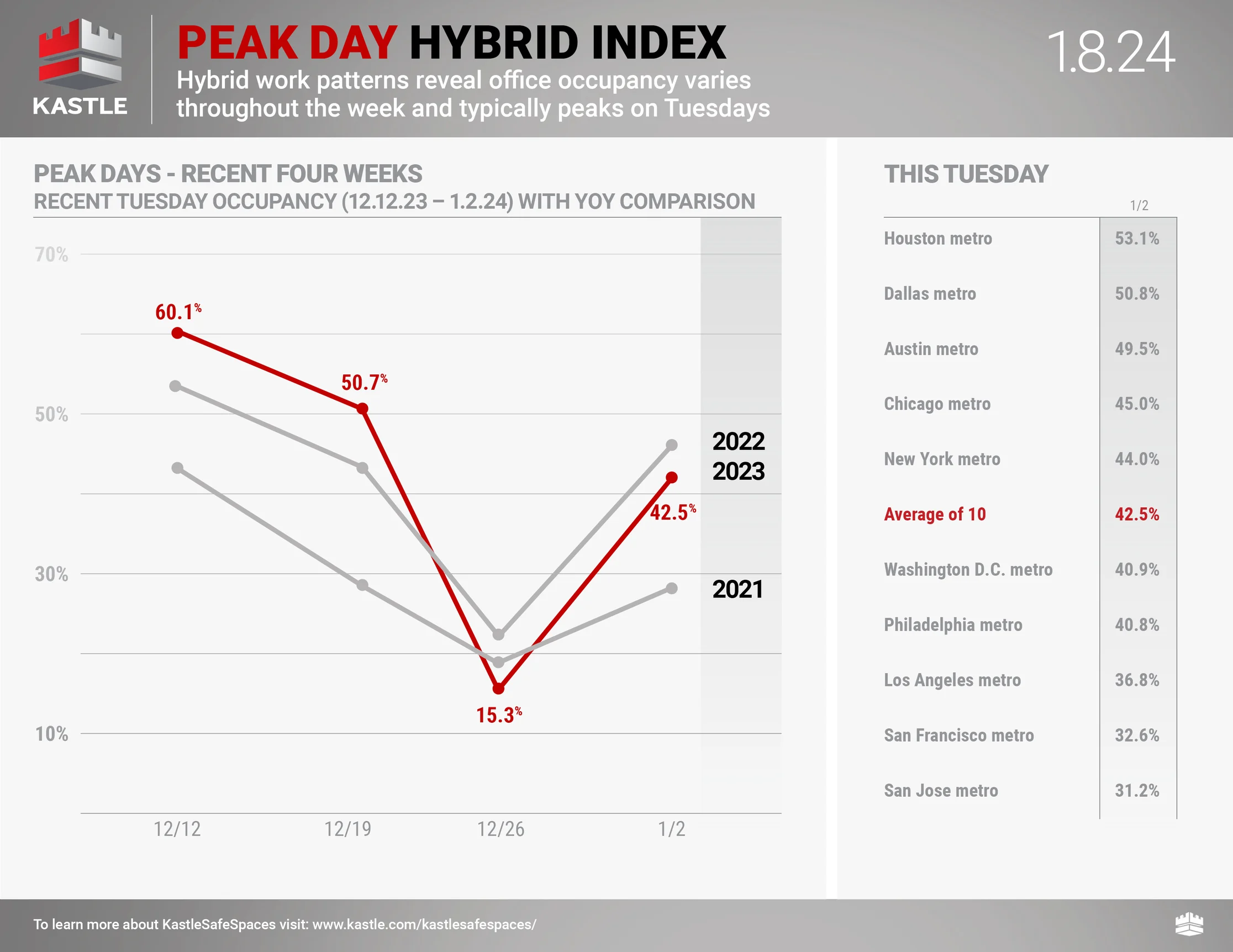 Remember that Kastle charts are overstating occupancy* because their pre-pandemic occupancy benchmark was 100%, which is incorrect (*measures card swipe activity as a proxy for occupancy). Still, they’ve become the standard benchmark for occupancy rates.