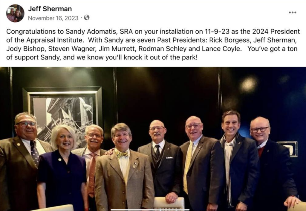 There can not be any doubt that Sandy Adomatis, the new Appraisal Institute president, is a significant, hard-core FOJ loyalist. Why did she snub immediate past president Craig Steinley at the installation like he wasn’t there and wasn’t in the photo? How petty and disrespectful. It shows us all that the cancer of FOJ still exists, and this fight is not over. All these FOJ former presidents were glad to be flown in on the membership’s dime. They can smell the grift potential to line their pockets again with Sandy in charge. And remember that “Dear Leader” had invoked the sham petition process to get Sandy in by overturning all the membership recommendations and the national nominating committee’s final recommendation because JA badly needed an FOJ. And next year, you’ve got Paula, another FOJ to look forward to. Fingers crossed, she won’t say something inappropriate.