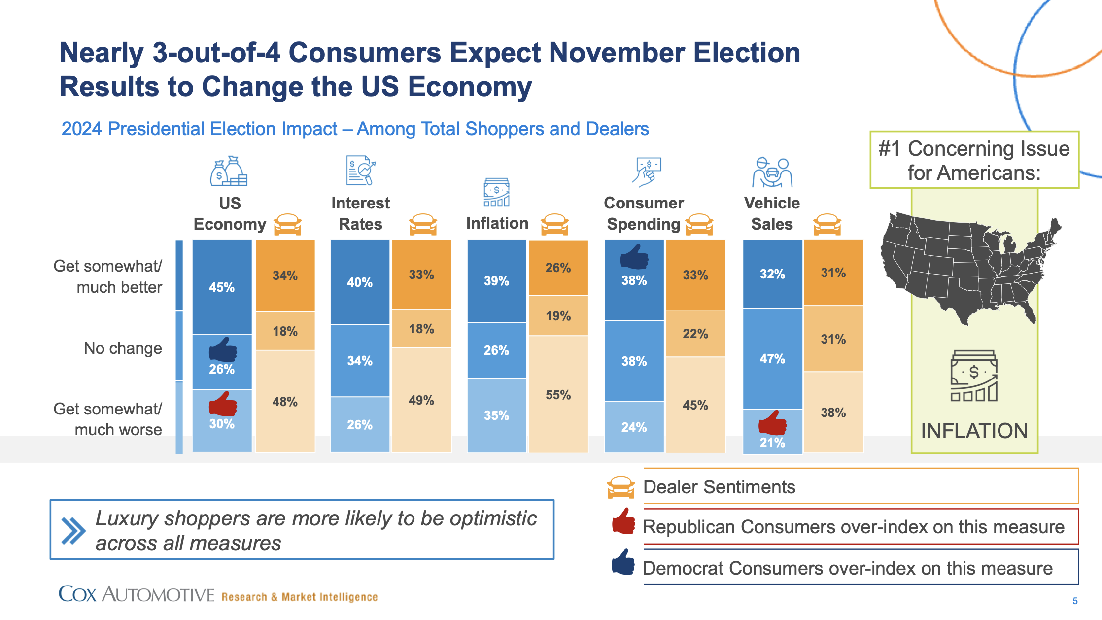 Amazon sees hesitation since the election is occupying consumer minds. QVC and Home Shopping Network see election-year pullbacks, as do auto sales. Here is an excellent consumer election research by Cox Automotive. Interestingly, they indicate that luxury shoppers are more optimistic across all issues. However, credit card usage towards bigger ticket items is on the downswing, as are fall wedding bookings.