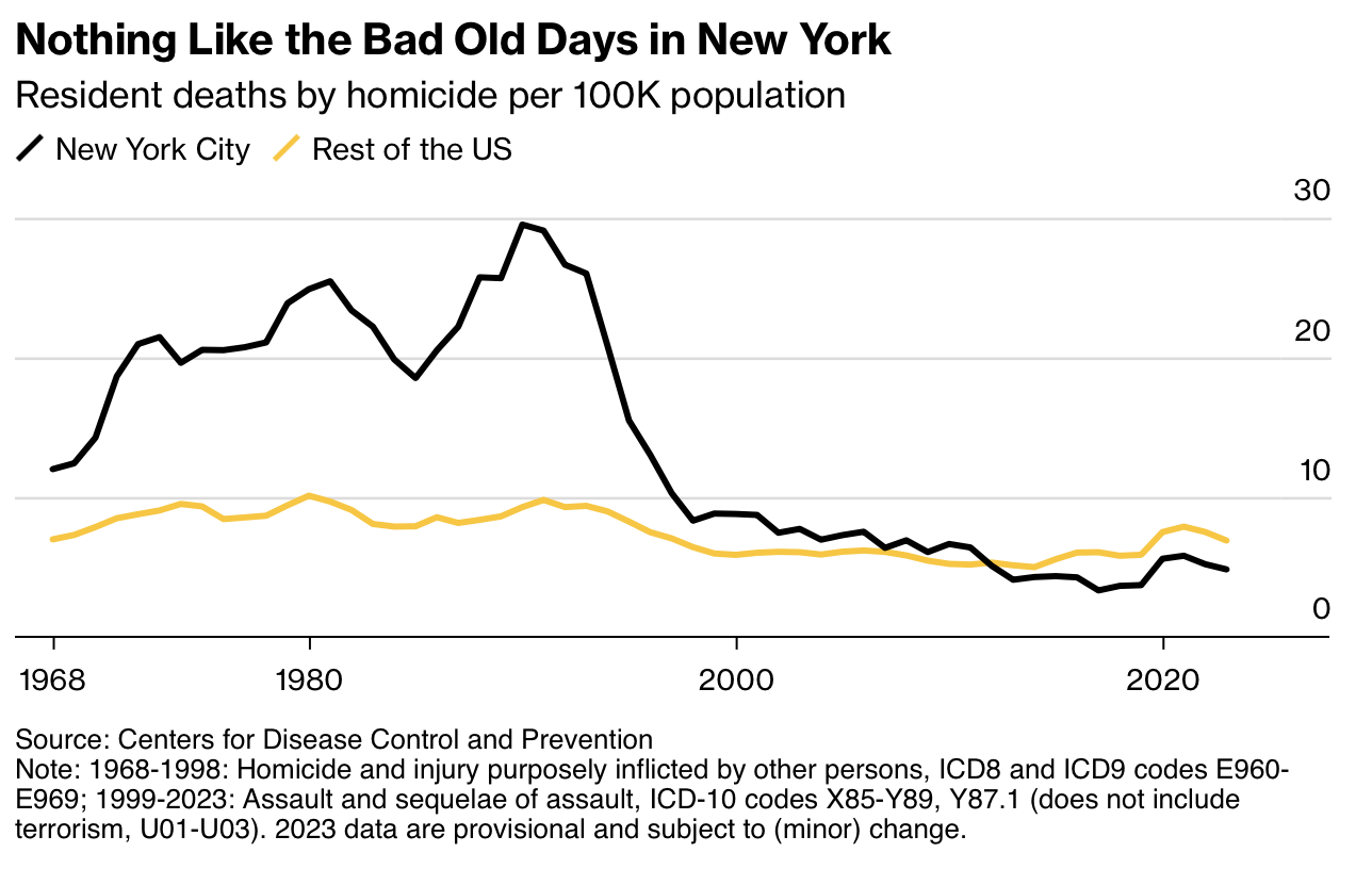 I’ve lived or worked in New York City since 1985 when my wife and I moved here from Chicagoland. The violent crime rate at the time was one of the highest on record, but for the first time in my life, I could buy strawberries at 3 am (my Dad always told me that was a key benefit of city living). Safety has significantly improved since then, and so have housing prices, but violent crime is not quite back to pre-pandemic lows. But NYC is now a lot safer than much of the U.S.