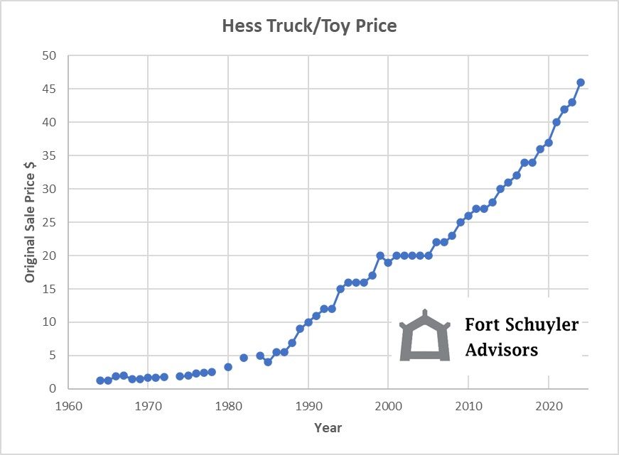 Over the past six decades, the annual cost of a new Hess Truck has risen from $1.29 to $45.99 for a 6.14% annual rate increase. Using the rate of inflation as a guide, it should only cost about $13.16 today. Ha. Hess seems to be price-gouging so I’ll stick to Big Macs.