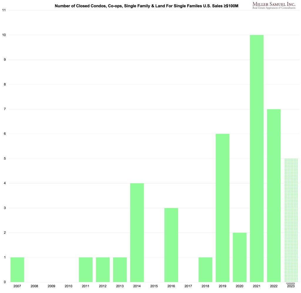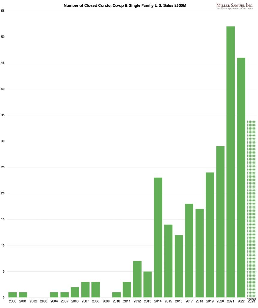 I began tracking the $50 million housing market in 2014 when I noticed that pricing seemed to have reset to a much higher level. After ten years of history, it is clear that this submarket is here to stay. This year – and it is not over yet – saw the third most sales at or above the $50 million threshold, even though we are in a “weak” housing market characterized by lower sales, stable pricing, and less listing inventory.