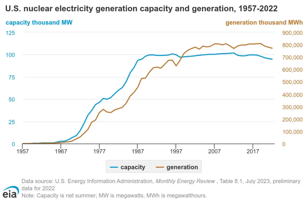 With the Three Mile Island disaster in 1979 and the Chernobyl disaster in 1986, electrical capacity has essentially leveled off. This is why the Microsoft announcement has proponents of nuclear energy encouraged for the first time in decades. Aside from these disasters, they create the ability to generate a lot of electricity without greenhouse gas emissions, the key issue causing global warming.