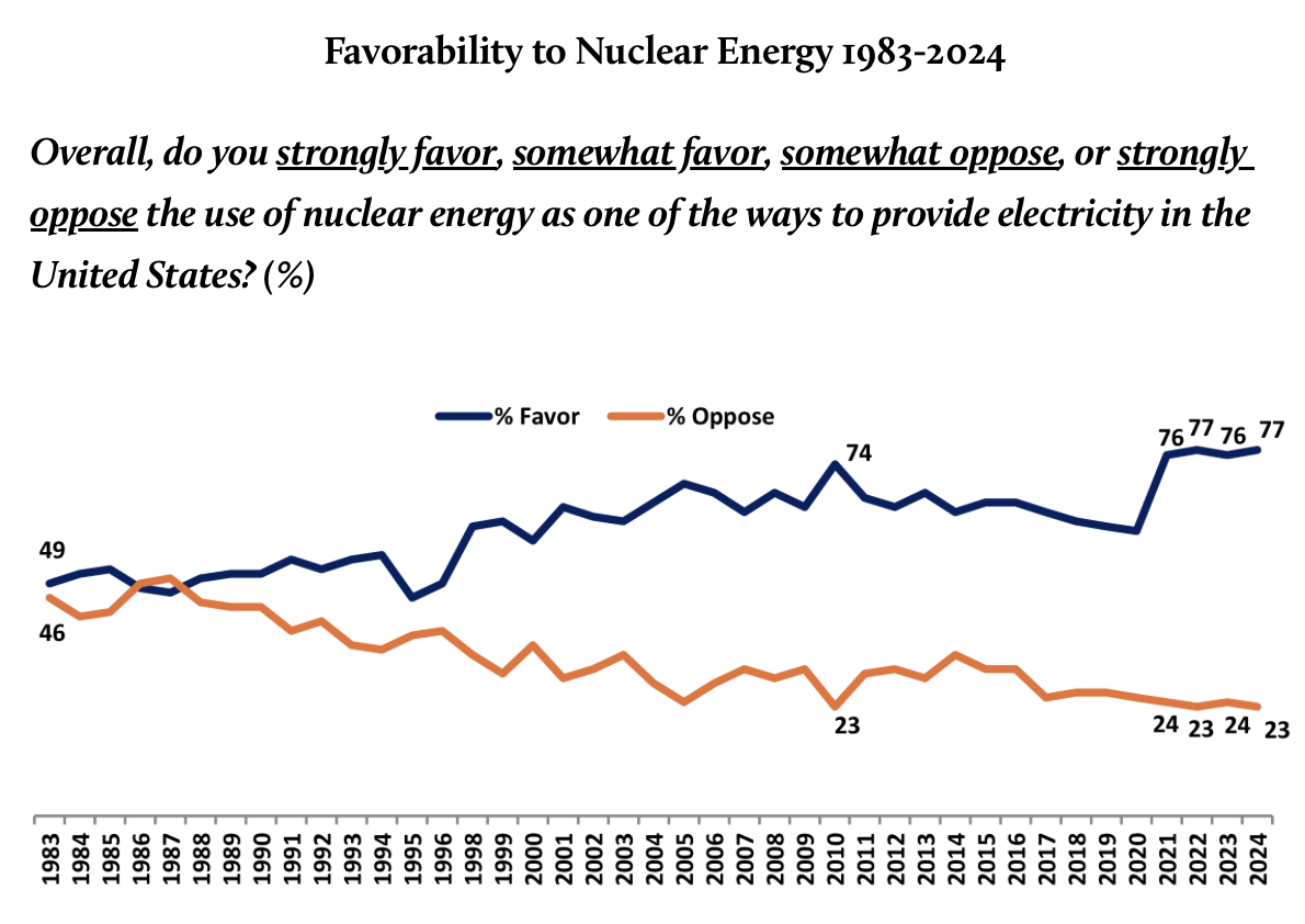 Public support for nuclear energy appears to be high and rising. The general takeaway is much more positive from people who live nearby, presumably because they have already rationalized their decision. Perhaps the logic comes down to why people choose to live in areas threatened by hurricanes, tornados, and wildfires. I don’t know, but I do know this is a topic that will be analyzed a lot more in the coming years.