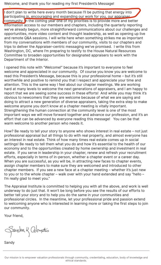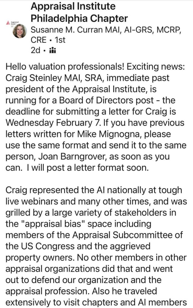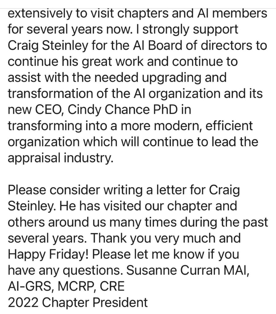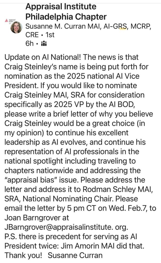 This announcement was known by most people at AI who keep up to date on operations. A past president runs the National Nominating Committee (NNC) and Craig is just that. He recused himself from those duties to run for Vice President to get a professional back on the ladder of leadership to continue the breathless amount of work accomplished in 2023. This year with Sandy and next year with Paula will see little productive work for the Appraisal Institute because it is against their personal interest as FOJs. Personal branding/resume padding is all we will see from these FOJs in 2024 and 2025.