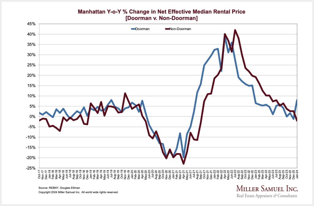 - – Doorman median rent expanded annually as non-doorman median rent fell over the same period.