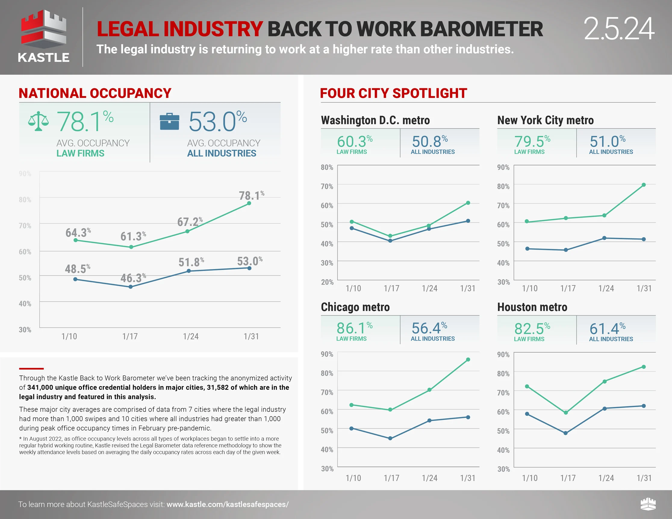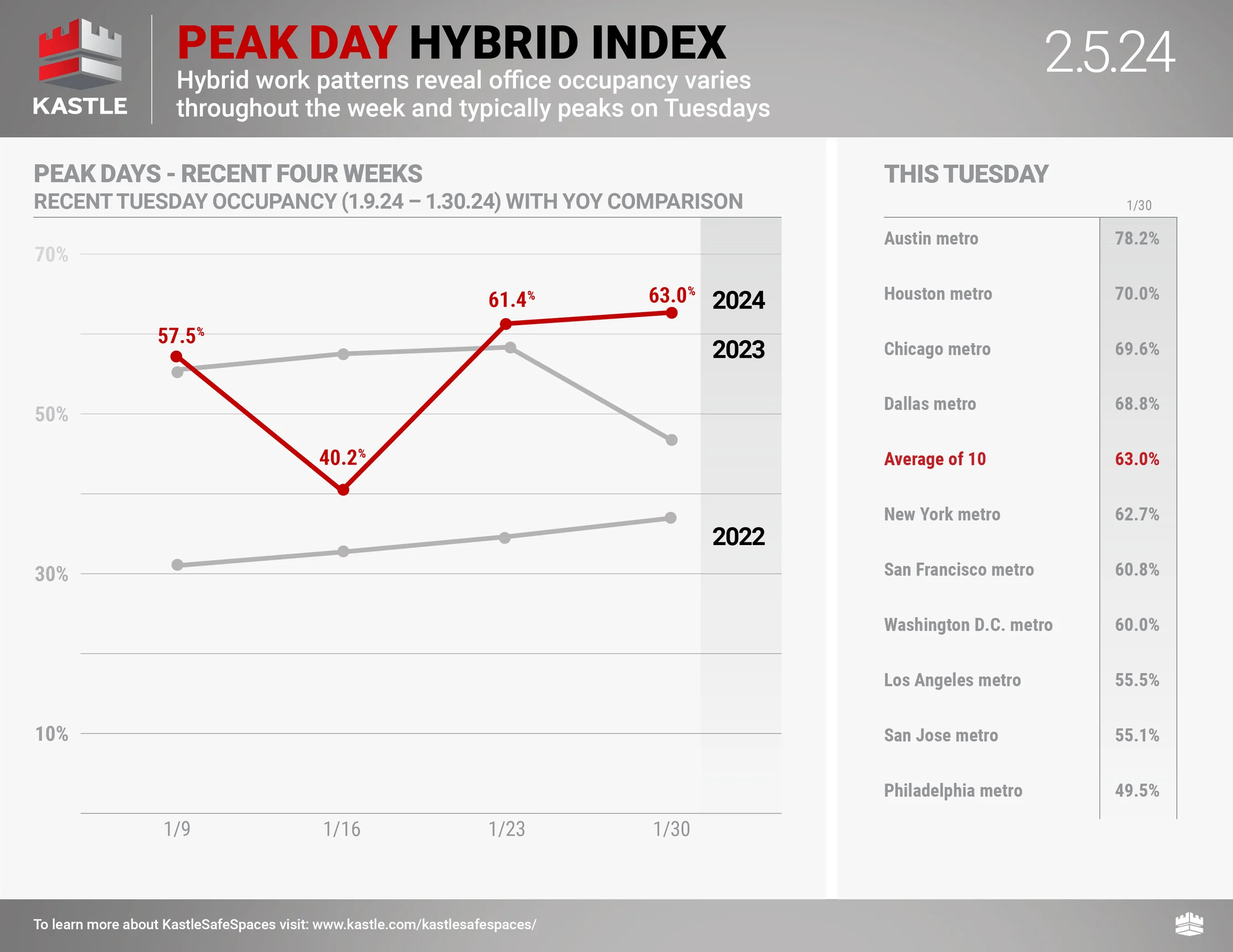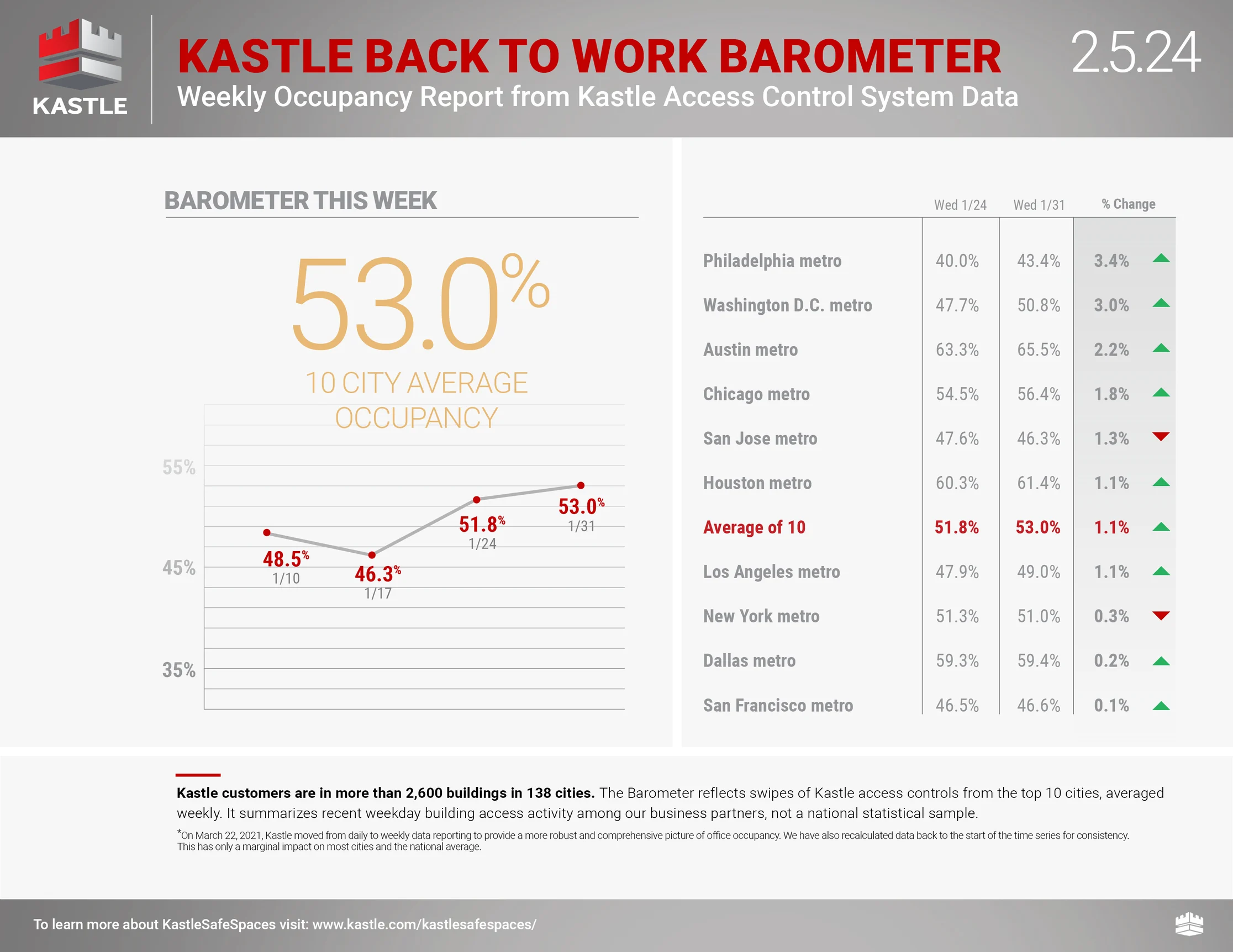Remember that Kastle charts are overstating occupancy* because their pre-pandemic occupancy benchmark was 100%, which is incorrect (*measures card swipe activity as a proxy for occupancy). Still, they’ve become the standard benchmark for occupancy rates.