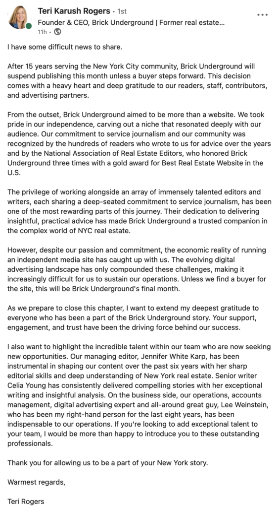 This is quite a loss for the New York residential housing market. Founder Teri Rogers announced the suspension of publishing for Brick Underground via LinkedIn on Thursday.