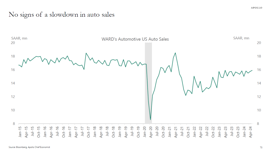 Car buying tends to do better with a strong job market (which keeps rates high) and high wages. We continue to see high rates because of low unemployment, the latter of which helps the car market.