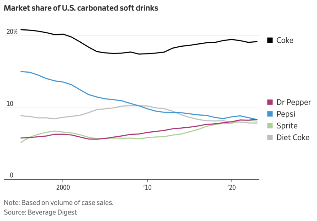 Since Diet Coke and Sprite are owned by the same company that owns Coke, it is important to classify “tied for second” as a very distant “second” for Dr. Pepper.