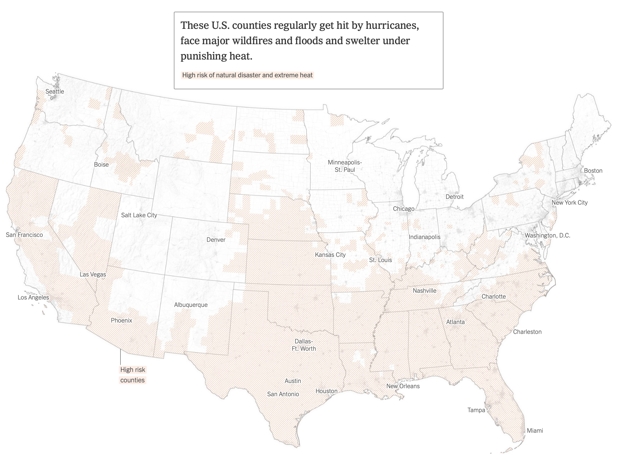 One of the by-products of the WFH movement has been increased migration patterns into more exposed locations. High cost housing markets like New York and California have been losing residents to the sunbelt like Texas and Florida which are higher risk locations. The New York Times’ recent visualization piece (gift link) Where Americans Have Been Moving Into Disaster-Prone Areas is quite overwhelming.