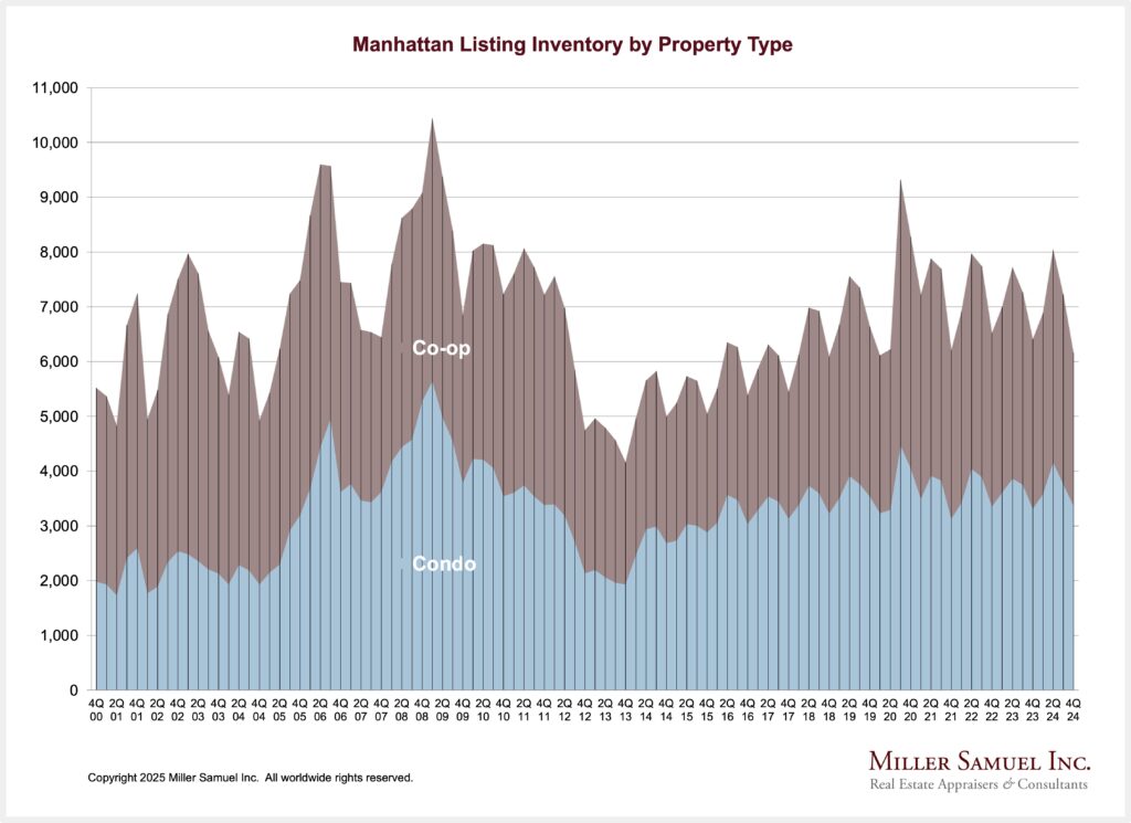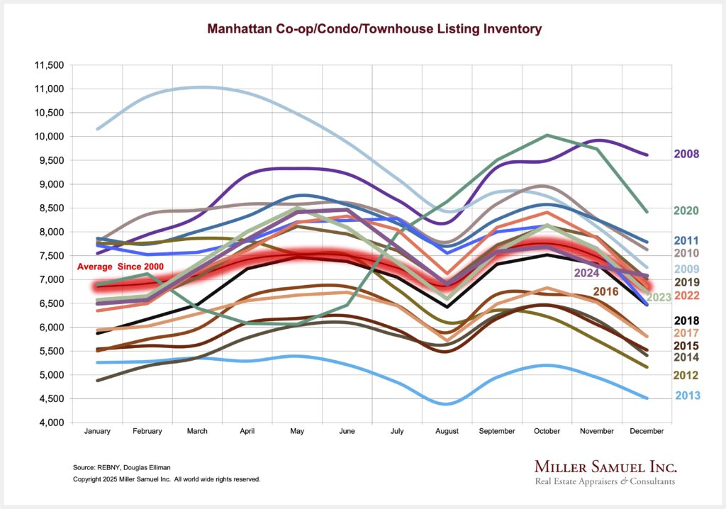 I’ve been manually tracking inventory for nearly 25 years and current levels are consistent with the long-term average. Many in the Manhattan brokerage industry have the sense that supply is tight. However, the empirical reality is that the pricing of inventory tends to be high, meaning that many of those listings are “on” the market but not “in” the market so supply feels constrained to agents trying to find properties for their customers.