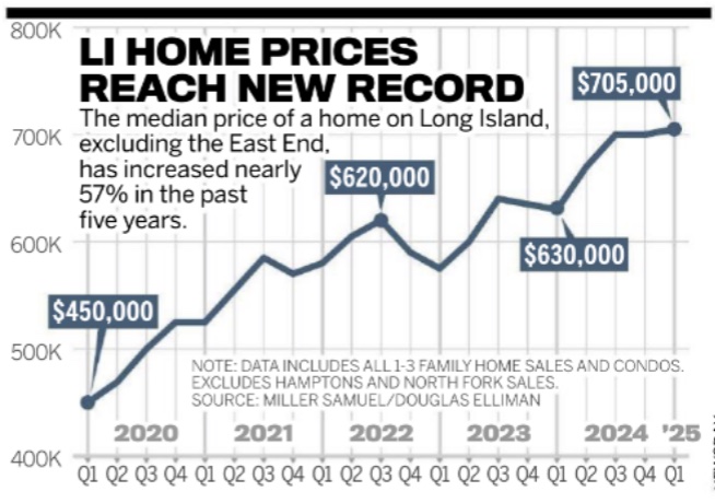 - Long Island home prices rose to record high of $705,000 in the first quarter [Newsday]