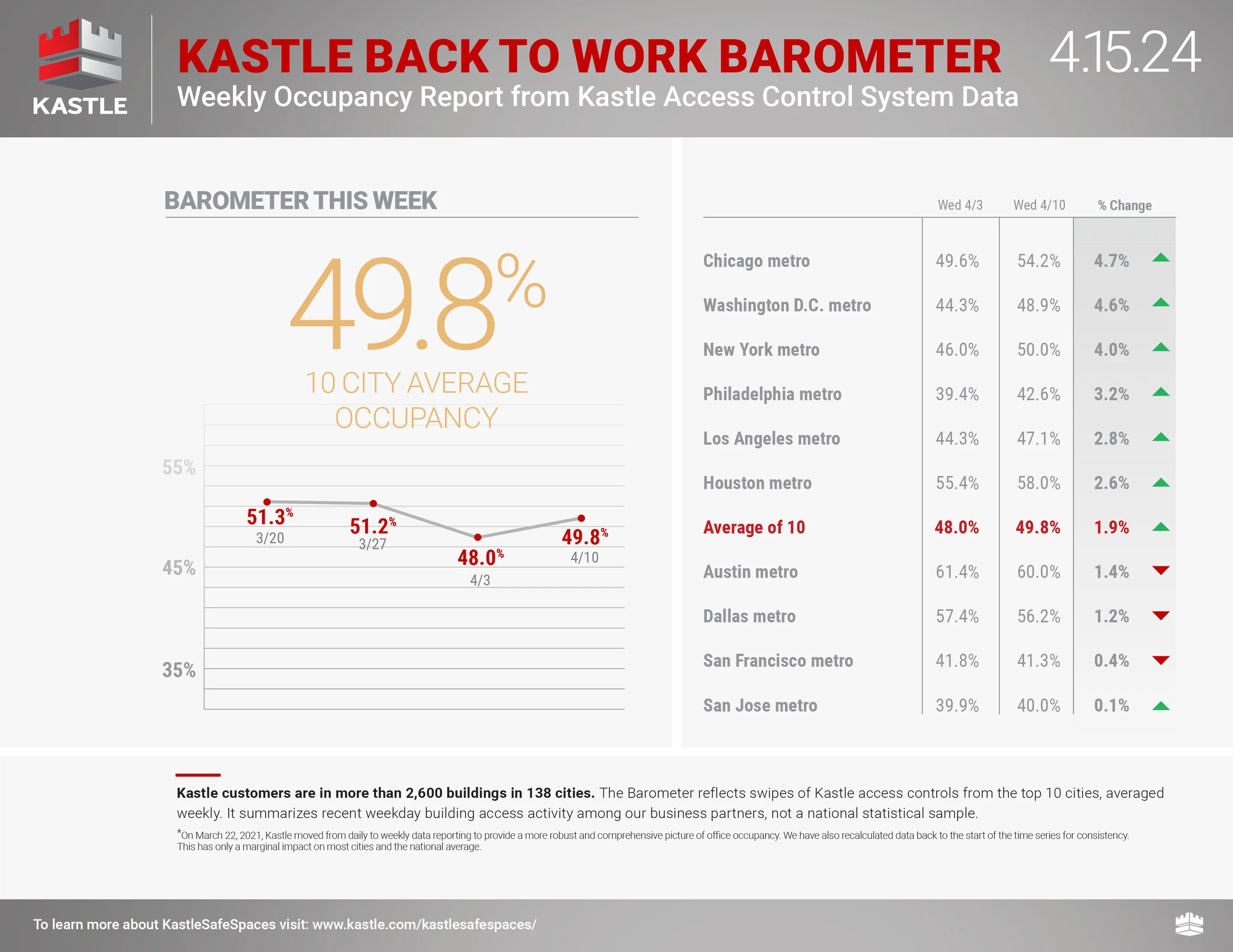 Remember that Kastle charts are overstating occupancy* because their pre-pandemic occupancy benchmark was 100%, which is incorrect (*measures card swipe activity as a proxy for occupancy). Still, they’ve become the standard benchmark for occupancy rates.