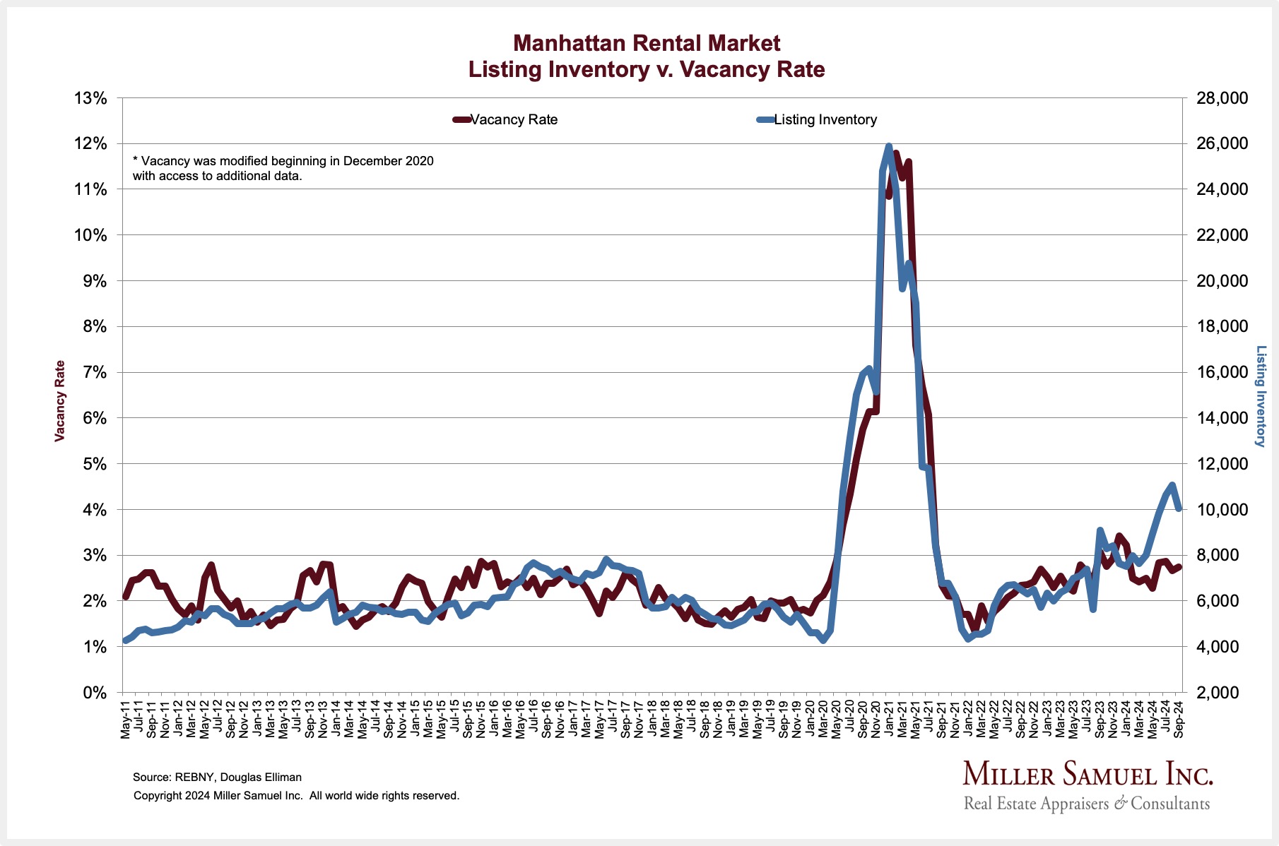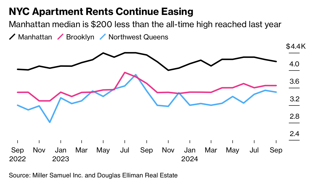 I’ve been in California for a while, helping launch our start-up (more on that soon). It’s been a five-year effort, so it was exciting to see it actually go live and show some early success. I also got to catch up with some good appraiser friends out here, but I’m tired and ready to head back to New York tomorrow. All my friends in Florida weathered (sorry) Milton, thankfully. It was quite fun to publish our Manhattan, Brooklyn, and Queens Rental report for September today. The rental market messaging remained mixed. Year over year, rents slipped but remained elevated, even though bidding wars were still a thing. I keep wanting to say that the rental market is normalizing, but really, after the five-year rental market roller coaster, who knows what normal is anymore? The vacancy rate is in line with the long-term average for September, while inventory rose at a much lower rate than new lease signings. The weakness in rents continued to be influenced by the decline in mortgage rates over the summer, which resulted in a surge in newly signed contracts. Essentially, lower rates are pulling would-be buyers back into the purchase market and taking some of the pressure off rentals. Bloomberg’s coverage of our research stated it best: NYC Apartment Renters Get a Break But Bargains Remain Elusive. And they’ve got the chart in two colors!