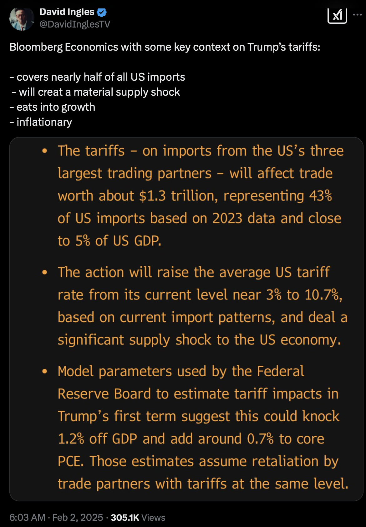 “Turning to the 25 percent tariff on Canada and Mexico and 10 percent on China, we estimate an inflation impact of 0.5 to 0.8 percentage point, depending on the markup assumption. Under the more extreme scenario of a 60 percent tariff on China and a 10 percent tariff on the rest of the world, we estimate an inflation impact of 1.4 to 2.2 percentage points.”