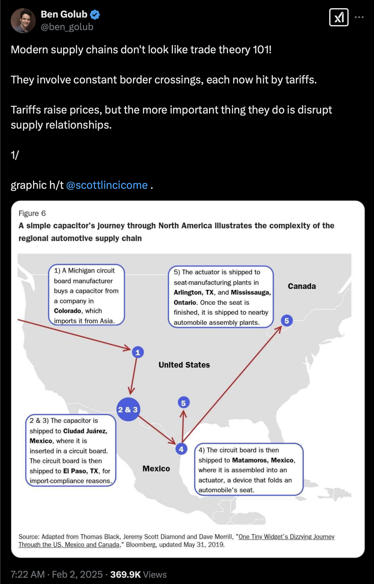 Each time a part crosses the U.S. border, it would incur a tariff. Here’s one example.