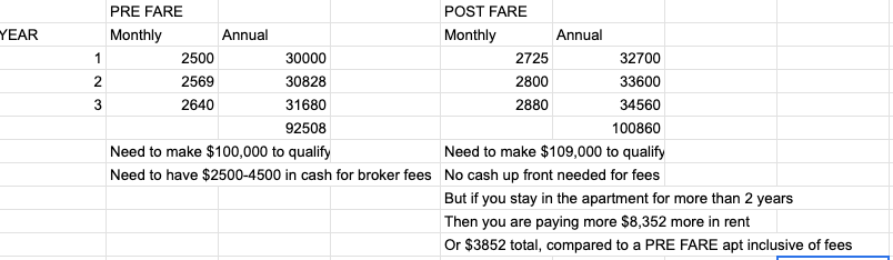 First, thank you for your work on this newsletter. I’ve come to look forward to reading it as a real estate agent in Manhattan, who covers all five boroughs and has friends in the business around the country. You get the market in NYC but you also understand the national dynamics. Now regarding FARE, what people do not understand is that one of the main reasons rents are so high in NYC is because people are willing to pay for it. The vacancy rates for NYC apartments are low because there is huge demand. We need to change the supply side of the equation to really make any impact on pricing. That being said it is easy to demonize agents, and blame them for all the problems with the housing market. You are correct that landlords will fold the cost of hiring an agent into the rental price. Seems like an ok scenario for a renter, right? It hurts less to have to pay an additional 1-2 months of rent as a fee upfront. But what FARE does is penalize the long term renter, which most NYers are. See why in my example below. Now imagine this scenario over 10-15 years. How much more is a NYer paying in rent because of FARE over a lifetime?Has anyone on the City Council done this simple math? I’m doubtful they did. Would love to hear your opinion on my points.