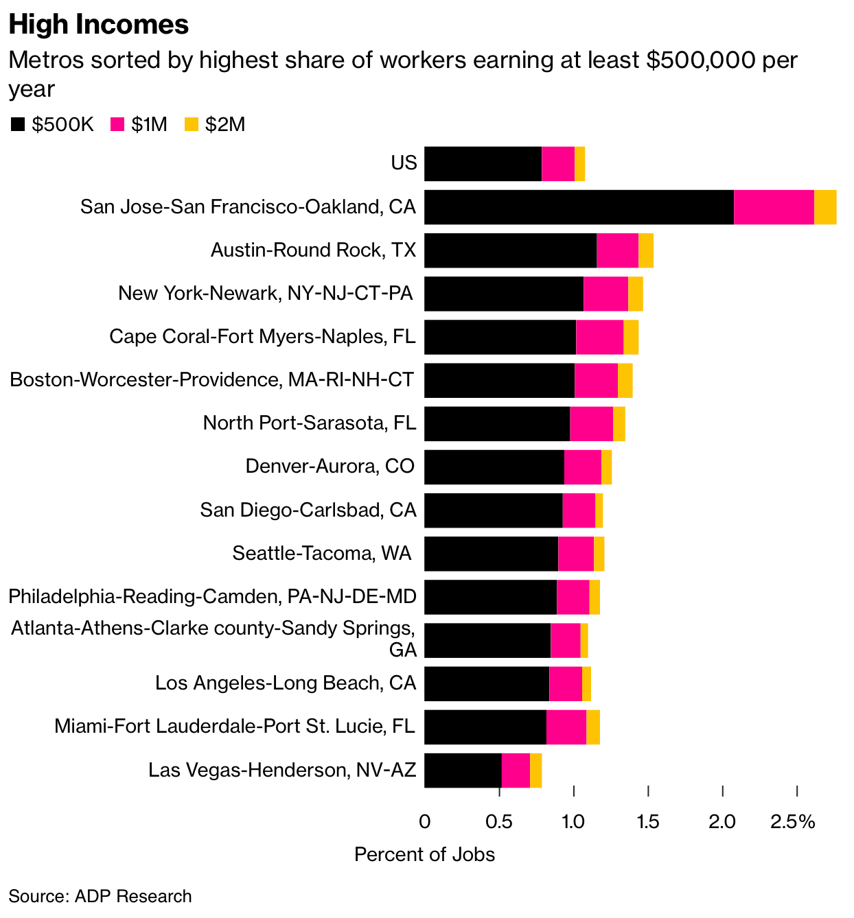 “The study found that about one in 127 jobs in the US pays more than $500,000 a year. In San Francisco that ratio is less than one in 50 — which is also the biggest share in the US — with Austin and New York following, according to the research by Issi Romem, an economist at the ADP Research Institute, based on anonymized payrolls.”
