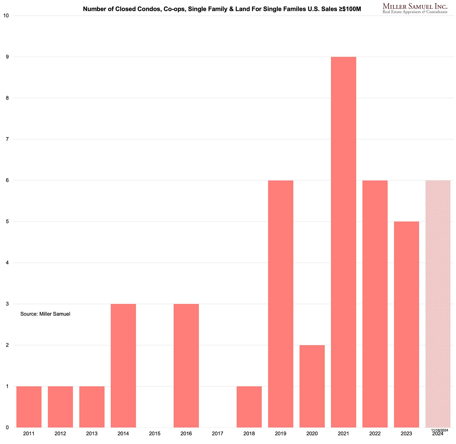 In my collection of $100+ million U.S. residential sales, the 2024 total as of today is tied with the second most on record – only three more are needed to tie the 2021 record and it is not unusual to see a cluster of these transactions at the end of the year. This is in sharp contrast to the below-normal sales levels of existing homes in the U.S. market.