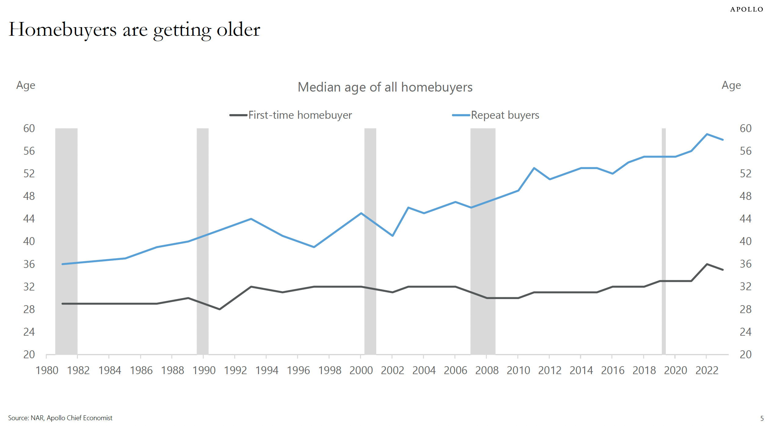 But the separation of first-time homebuyers from repeat homebuyers tells us something else. The age of first-time home-buyers has expanded by about six years, from 29 in 1981 to 35 in 2023, which is likely attributable to the rising cost of homeownership, beyond inflation. Much of the increase in homebuyer age has occurred in repeat buyers, rising from 36 to 49 over the same period.
