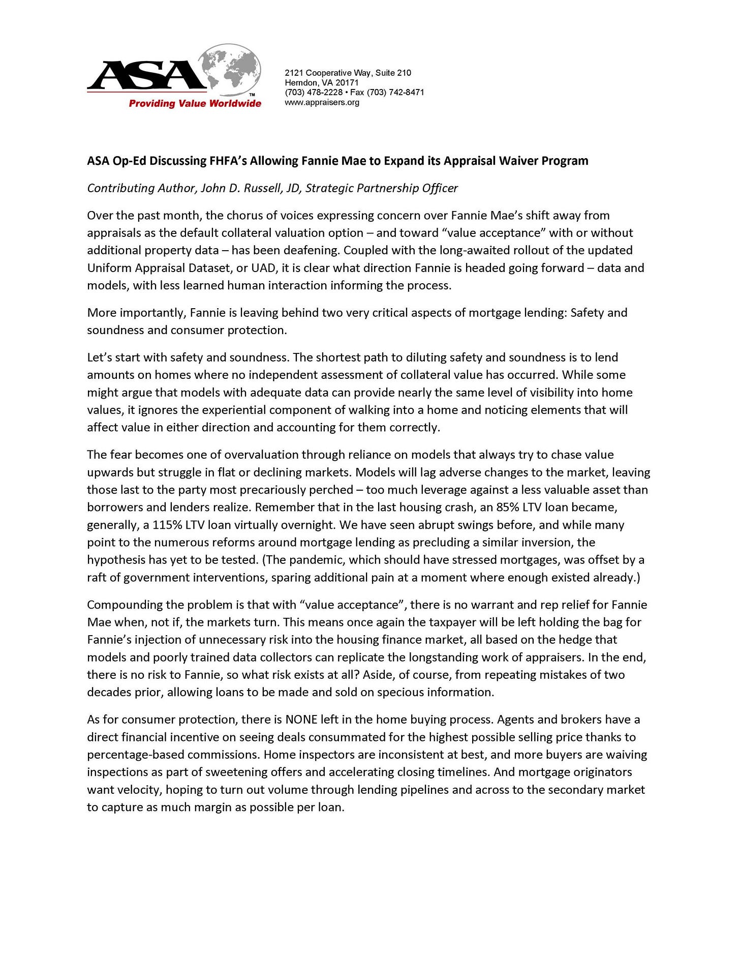 ASA’s John Russell On Fannie Mae’s Expansion Of Appraisal Waivers: No One Left For Consumer Proections