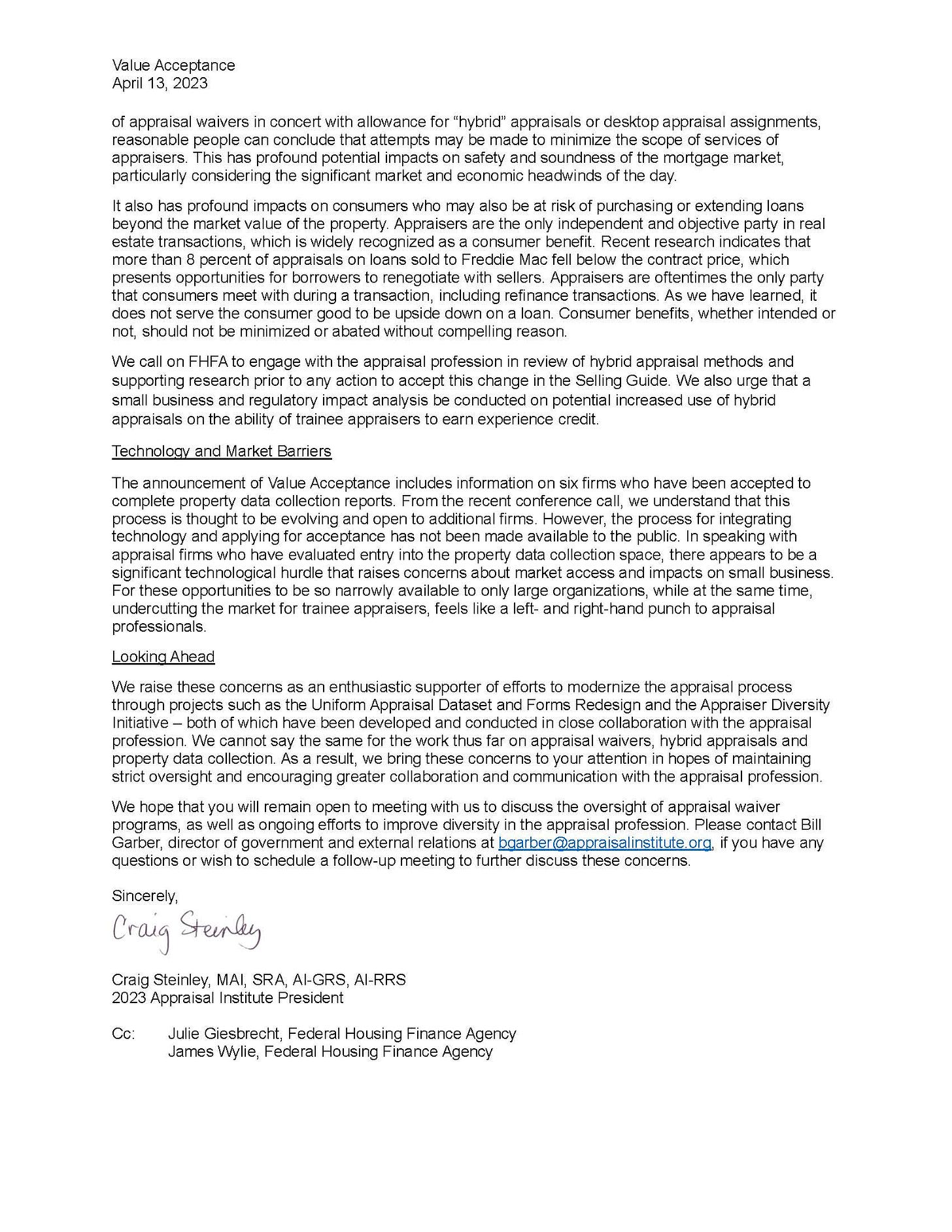 The following letter to FHFA provides an overview of Fannie Mae’s initiatives that will inevitably threaten collateral integrity in the multi-trillion bond market. Fannie Mae seems to be working hard to disincentivize new appraisers from entering the profession. Kudos to Craig Steinley’s leadership.