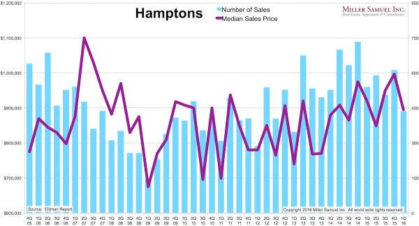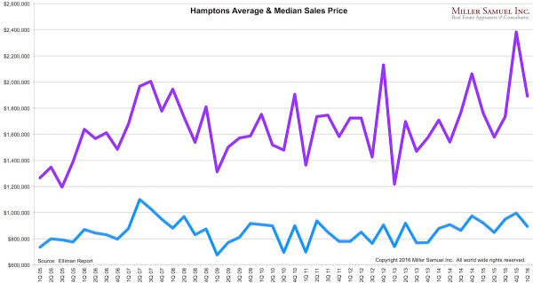 Elliman Report: Hamptons Sales 1Q 2016 After a record setting close of 2015, the performance of the Hamptons housing market was more modest in the first quarter of 2016. Price trend indicators were mixed as the decline in sales outpaced the slight drop in supply. Median sales price slipped 2.8% to $895,000 from the year ago quarter, the third highest first quarter result since 2005. Average sales price increased 7.4% to $1,891,758 over the same period, the highest first quarter result in eight years. Price indicators for the luxury market, representing the top 10% of all sales, outperformed the overall market. Luxury median sales price was flat at $5,500,000 from the year ago quarter…