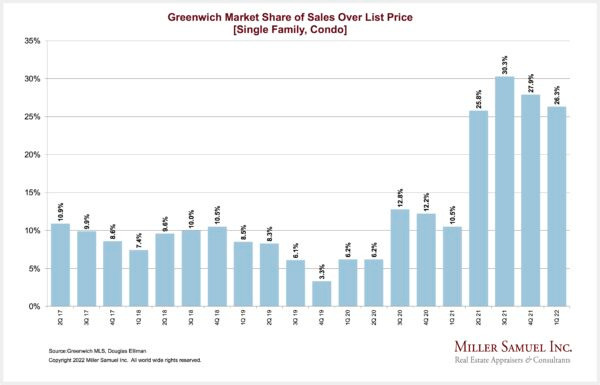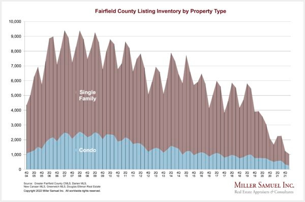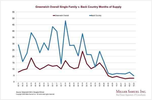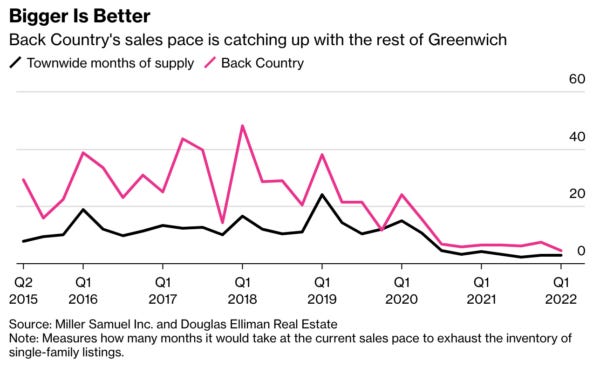 When I first started covering the Greenwich housing market 6-7 years ago, the area known as “Back Country” which is the region north of the parkway, didn’t sell. The predominantly big homes with a lot of land were generally overpriced by many multiples because the owners saw the NYC boom and applied the same growth to their luxury market, even though none was warranted. The high-end NYC suburban market was passed over after the financial crisis as affluent buyers were drawn to NYC and the new urbanism boom (just to be able to buy strawberries around the corner at 3 am from their NYC apartments). Well, remote work changed all that and the Greenwich market (and suburban luxury markets) have been booming in the pandemic era. Months of supply was four years in 2018 and now it is four months, on par with the pace of the overall market and all that excess listing inventory has been cleared from the market.