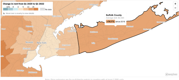 An epic U.S. county rental analysis interactive tool released by The Washington Post. In the NYC metro area, rents are rising faster in the outer reaches rather than within NYC itself.