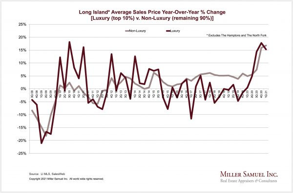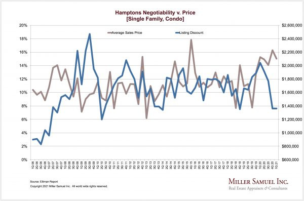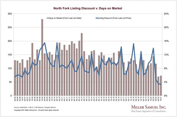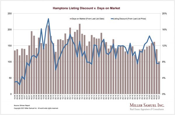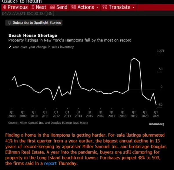 One of the pivots in the housing market post-COVID lockdown has been the inversion of market strength. Instead of housing markets reflecting a “soft at the top” characteristic, it has inverted with the lower end seeing less strength than higher-priced segments (not weakness, just less strength than higher price tranches). In the Hamptons and North Fork, overall listing inventory is way down as covered in The Real Deal Buyers hunt Hamptons, North Fork homes — often in vain. Sellers are owning the Hamptons market right now as reported in Mansion Global Hamptons Sellers Bask in a Luxury Buying Spree.