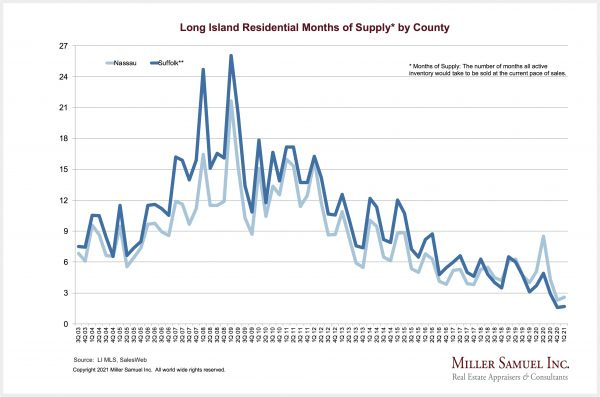 Hamptons listing inventory saw sharp gains after the federal SALT tax went into effect in January 2018 but the growth dissipated before the pandemic as late 2019 and early 2020 started to look better for sellers. However the past year has burned off a tremendous amount of inventory with record sales volume:
