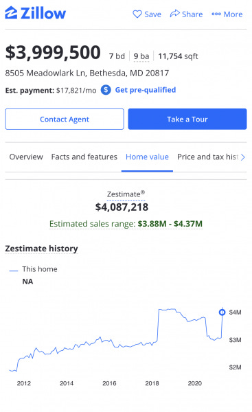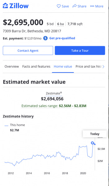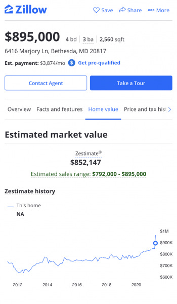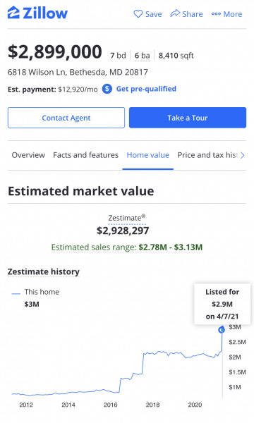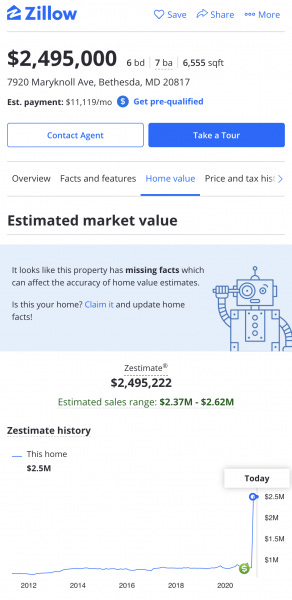 One of the worst kept secrets of the past several years is how much the listing price impacts the Zestimate. It’s almost as if the accuracy is so bad, they need the listing price for a reality check. In my mind, this is actually proof positive that Zillow knows Zestimate is terrible because it is overly reliant on the original listing price of the property. In a random test, I selected an area in Bethesda Maryland where I grew up and looked at the Zestimate trend for the first ten listings I saw. In every case, those listings caused the Zestimate to surge to meet the asking price. Incredible!