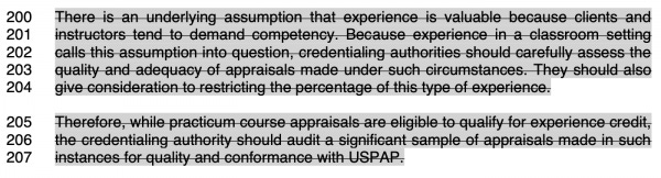 There is an underlying assumption that experience is valuable because clients and instructors tend to demand competency. Because experience in a classroom setting calls this assumption into question, credentialing authorities should carefully assess the quality and adequacy of appraisals made under such circumstances. They should also give consideration to restricting the percentage of this type ofexperience.Therefore, while practicum course appraisals are eligible to qualify for experience credit, the credentialing authority should audit a significant sample of appraisals made in such instances for quality and conformance with USPAP.