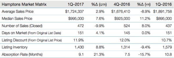 Here are the hard top line results for the Hamptons in 1Q17.