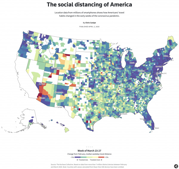 And another take on social distancing – a spectacular visualization from Reuters that shows correlations with household income and age. Not everyone is able (or willing) to social-distance.