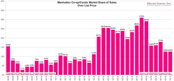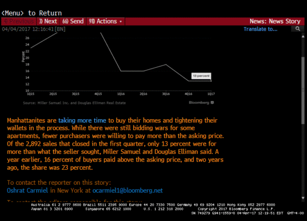 One of the topics of discussion has been the surge in the stock market since the election. We also see this point being made in the housing market. Real estate agent feedback speaks to pent-up demand accumulated before the election that was released after the election. We observed the same market pattern after the 2012 election so it doesn’t seem to be a factor of party or candidate. Manhattan resales jumped 7.7% year over year which was the highest increase in two years. We also continued to see the frequency of bidding wars drop to 12.6%, well below the 31% record set in 3Q15. Bloomberg charted our numbers.